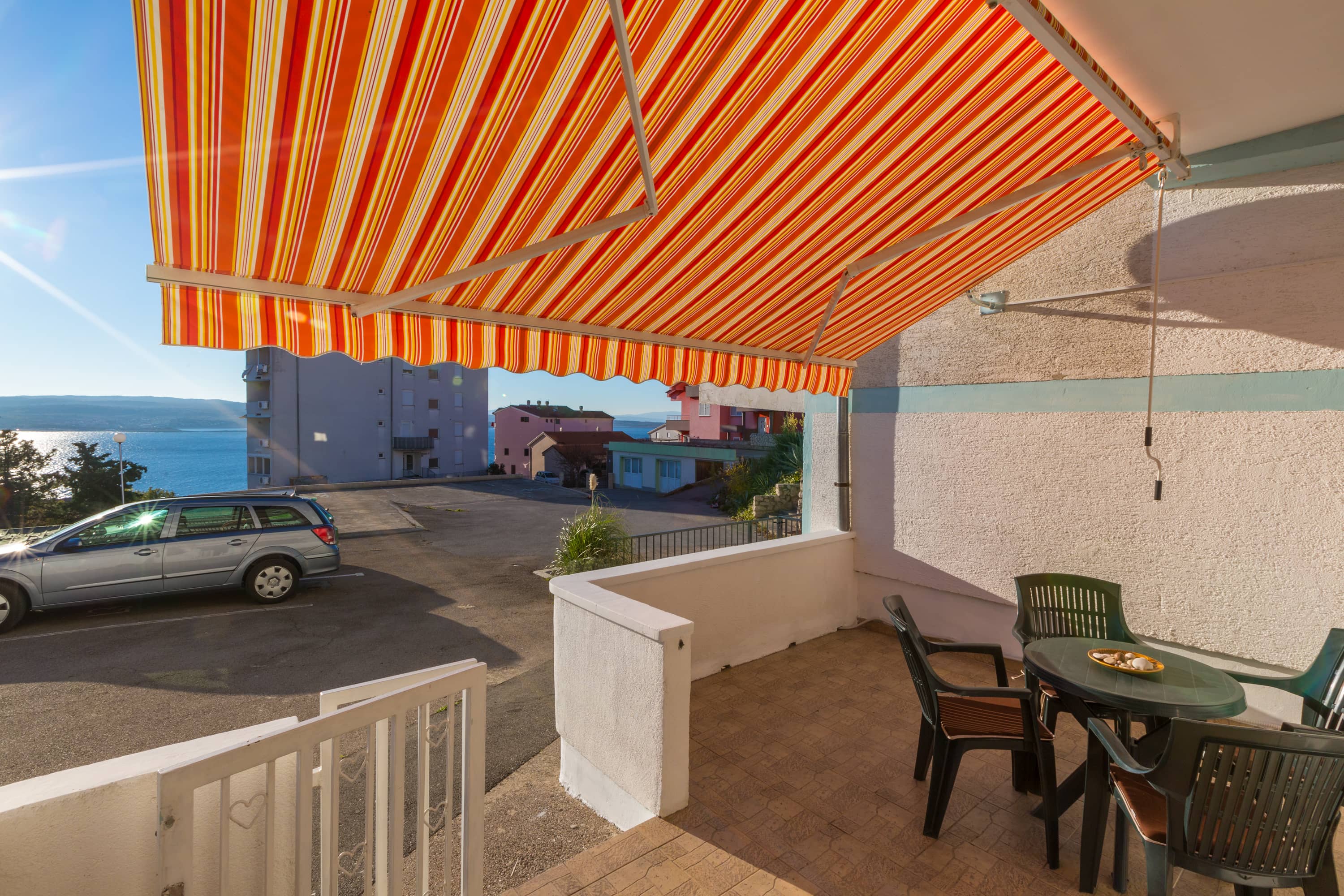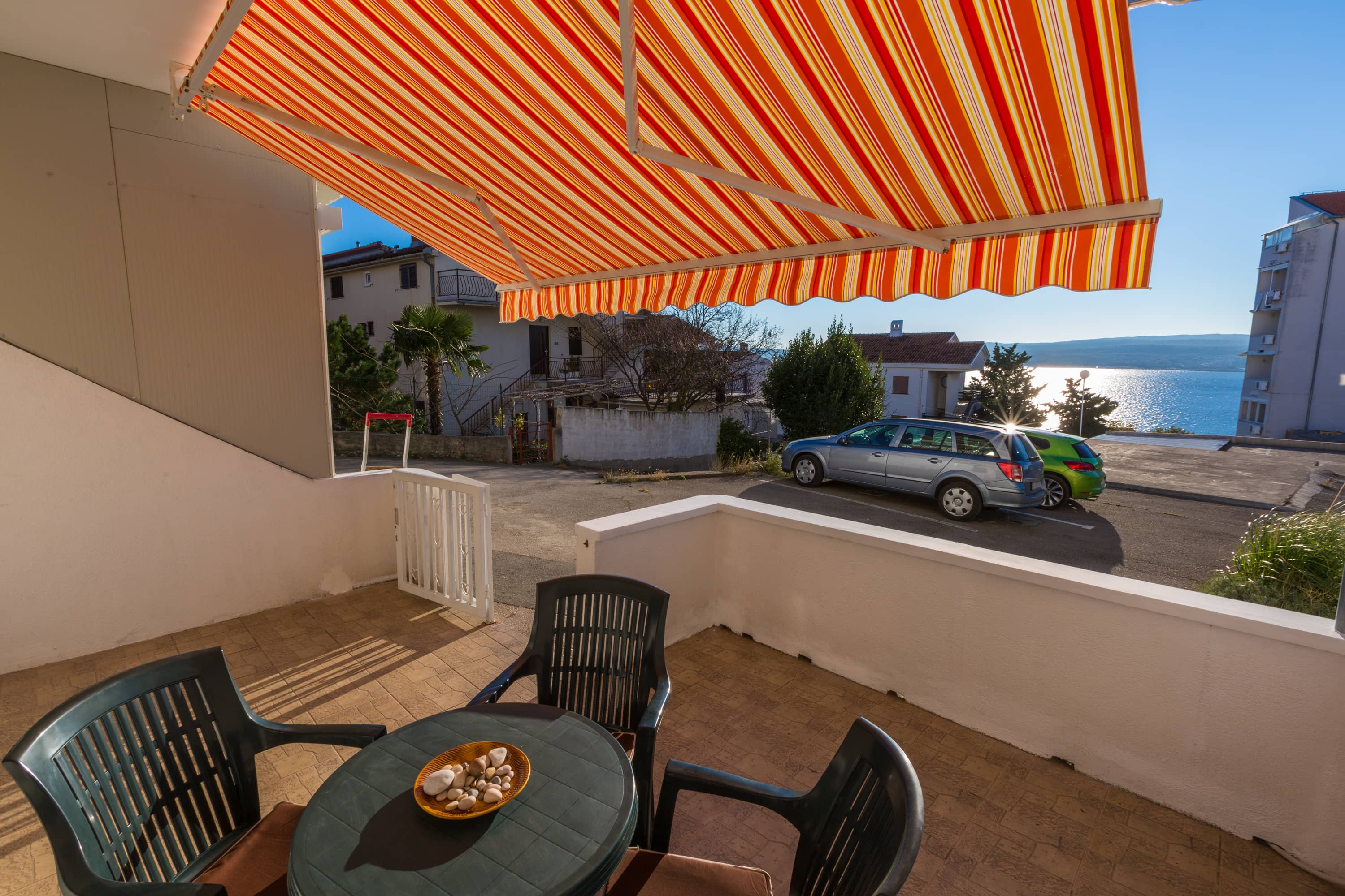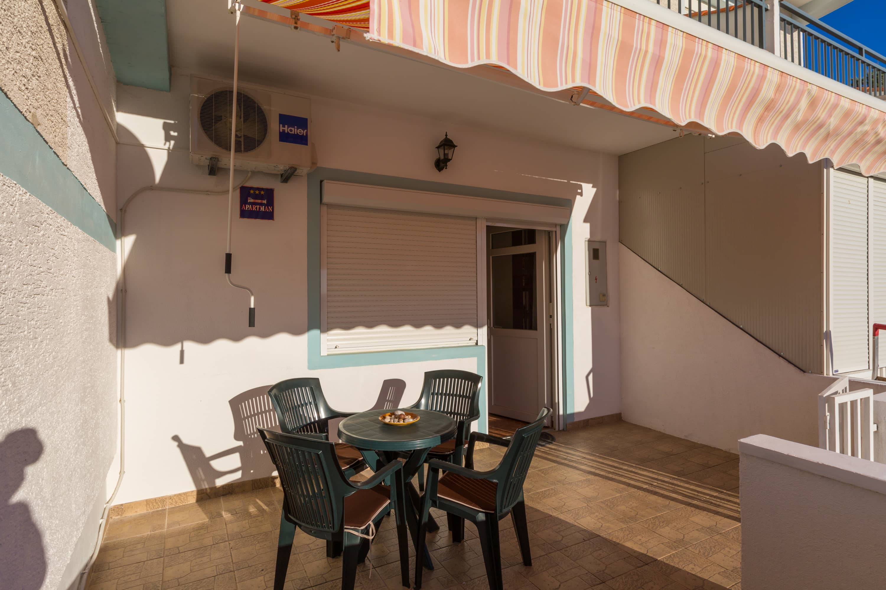 Apartman je u prizemlju zgrade novijeg datuma, a cijelo naselje je na laganom uzvišenju tako da se s terase pruža djelomičan pogled na more i susjedni otok Krk. Terasa je natkrivena tendom na razvlačenje. Parkirno mjesto je osigurano.  U spavaćoj sobi je bračni krevet, posteljina se mijenja svakih 7 dana bez nadoplate. U dnevnom boravku se nalazi kutna garnitura na razvlačenje s dva dodatna ležaja. U sklopu dnevnog boravka je i mala kuhinja sa svim potrebnim dodacima, uključujući i frižder s malim zamrzivačem, kuhinjski pribor, kuhalo za vodu, pećnicu, štednjak na struju, mikrovalnu pećnicu, kao i stol za blagovanje.  U kupaoni se nalazi tuš kada, i perilica za rublje. Ručnici se mijenjaju svakih 7 dana.  Apartman je opremljen s klima uređajem, TVsat i wi-fi pristupom, uključenim u cijenu kao i završno čišćenje apartmana.