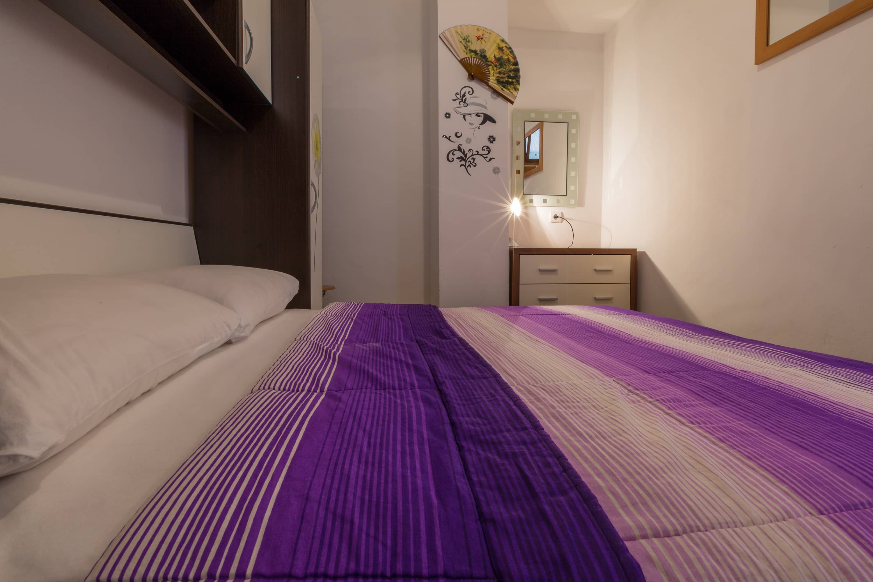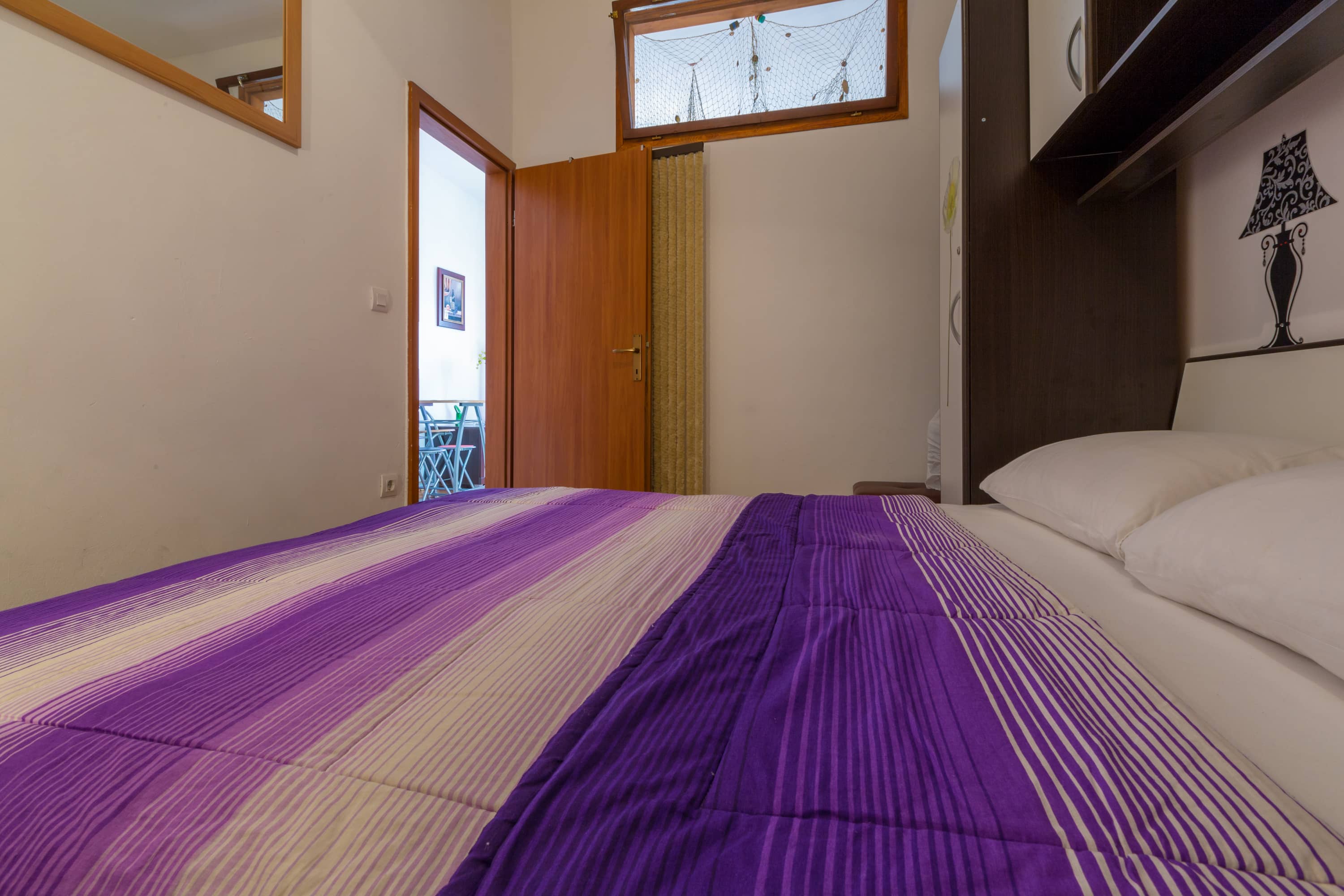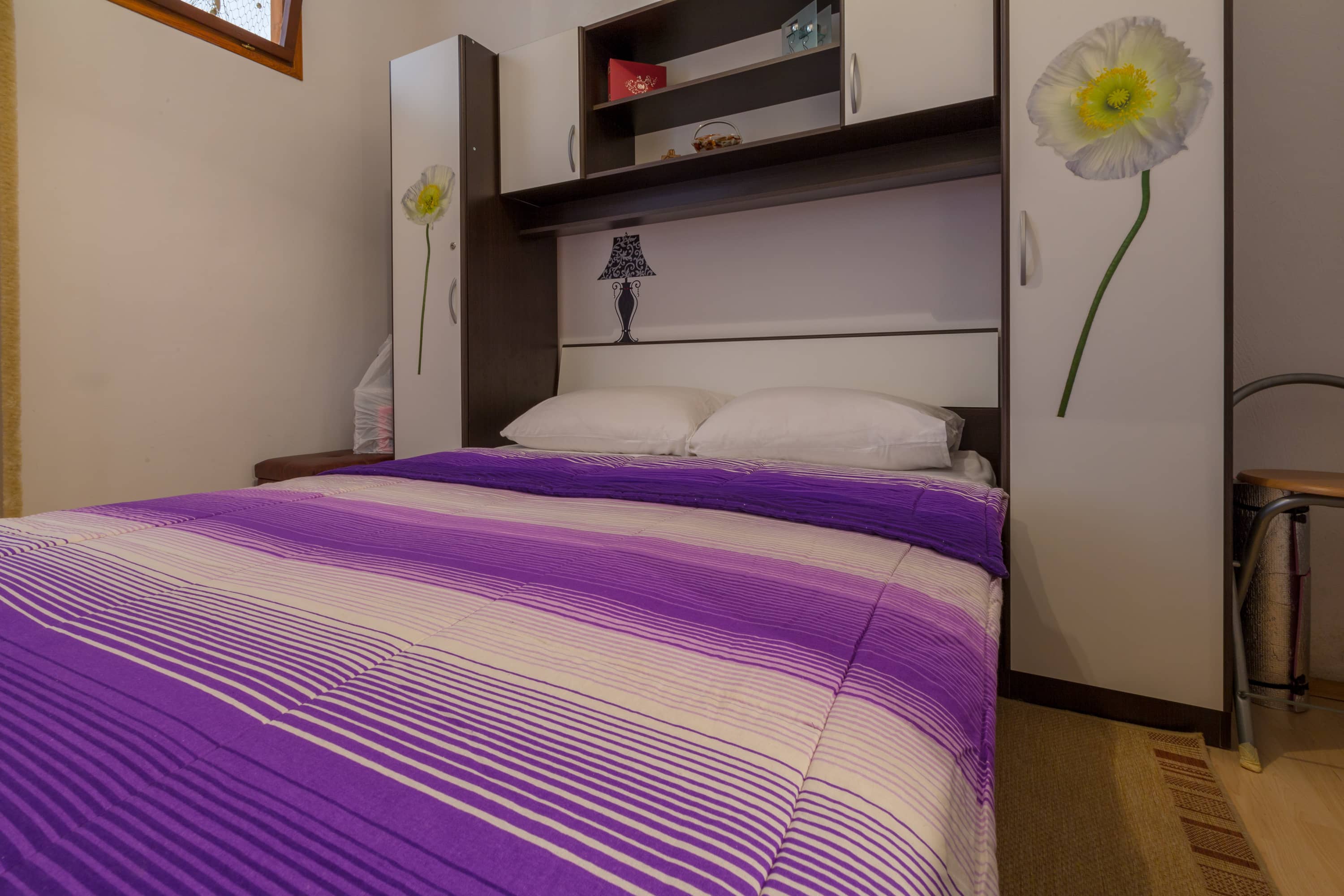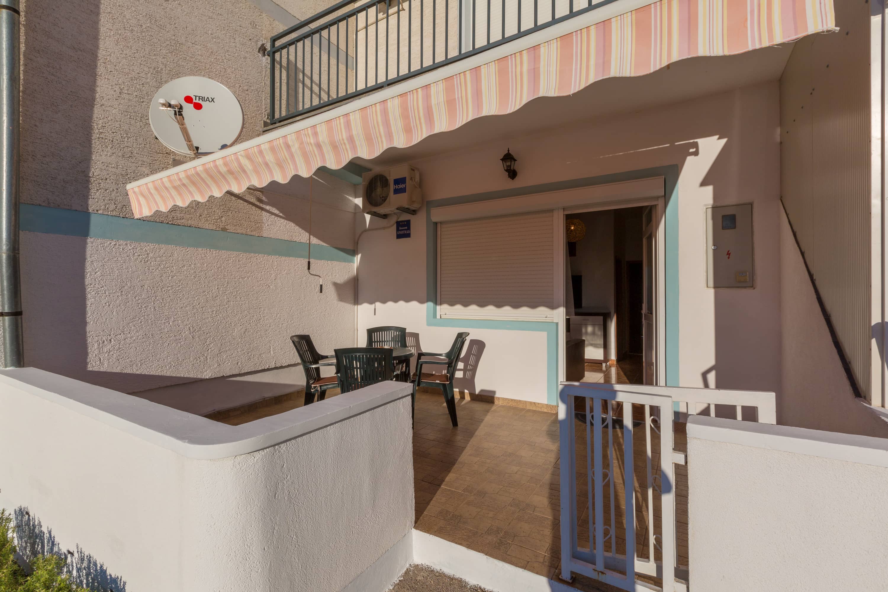 Apartman je u prizemlju zgrade novijeg datuma, a cijelo naselje je na laganom uzvišenju tako da se s terase pruža djelomičan pogled na more i susjedni otok Krk. Terasa je natkrivena tendom na razvlačenje. Parkirno mjesto je osigurano.  U spavaćoj sobi je bračni krevet, posteljina se mijenja svakih 7 dana bez nadoplate. U dnevnom boravku se nalazi kutna garnitura na razvlačenje s dva dodatna ležaja. U sklopu dnevnog boravka je i mala kuhinja sa svim potrebnim dodacima, uključujući i frižder s malim zamrzivačem, kuhinjski pribor, kuhalo za vodu, pećnicu, štednjak na struju, mikrovalnu pećnicu, kao i stol za blagovanje.  U kupaoni se nalazi tuš kada, i perilica za rublje. Ručnici se mijenjaju svakih 7 dana.  Apartman je opremljen s klima uređajem, TVsat i wi-fi pristupom, uključenim u cijenu kao i završno čišćenje apartmana.
