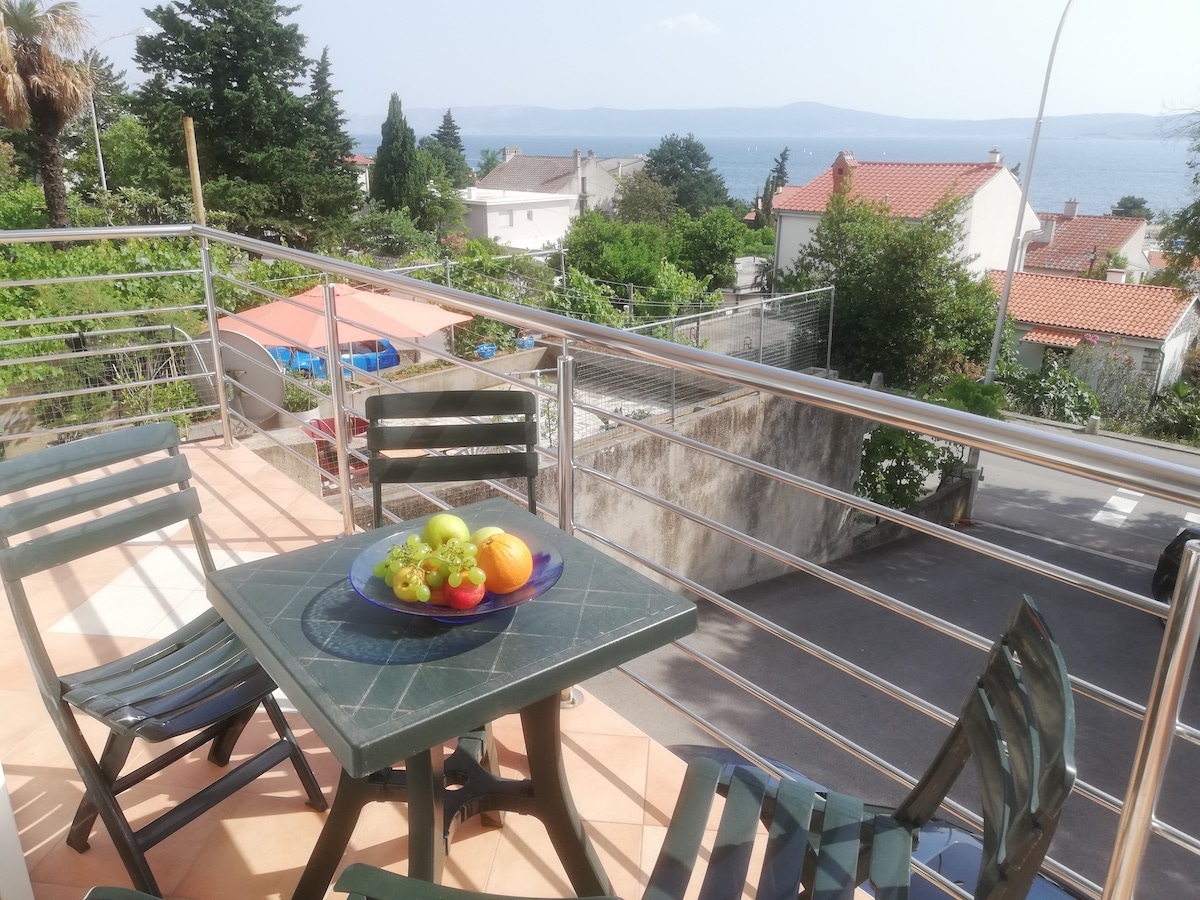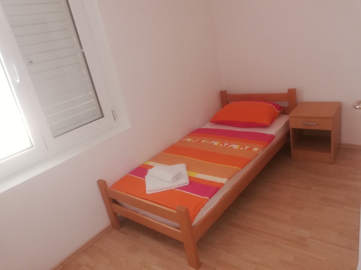 Apartman 3 (4+2), 80m2, je na 1.katu, to je prostran stan na cijeloj etaži Vile. Sa južne strane ima balkon s kojeg se pruža pogled na more. Ima dvije spavaće sobe, u jednoj je bračni krevet a u drugoj dva odvojena ležaja, te dnevni boravak sa kaučem koji se može razvući u ležaj za dodatne dvije osobe.